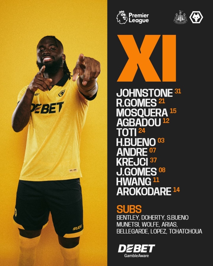 沃尔特马德首秀!纽卡vs狼队首发:托纳利、吉马良斯、黄喜灿先发